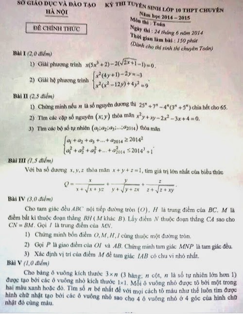5. Đề thi vào lớp 10 năm học 2014 - 2015 trường THPT chuyên Đại học Khoa học Tự nhiên Hà Nội.